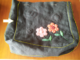 가방 손잡이를 연결하기 전에 가방 윗쪽을 안팎 시접정리하여 완성선을 핀으로 고정해준다. 다림질을 한번 해 주면 더 편하게 작업할수있다.